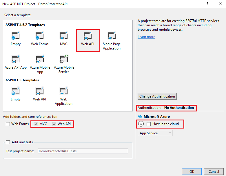Select the Web API template, set the Authentication to “No Authentication” and uncheck “Host in the cloud”. We will setup the authentication manually and host this locally in IIS Express for now.