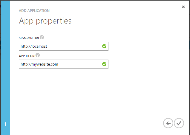 In the next screen, you can set the sign-on URL to http://localhost as it is not used for this type of authentication flow. The APP ID URI should be set to a unique value, its used as a unique logical identifier for your app.